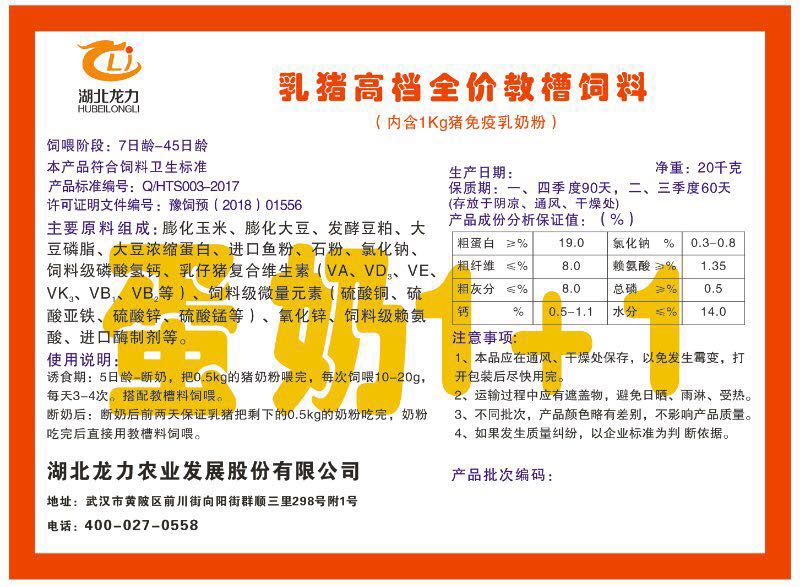 湖北龍力農(nóng)業(yè)發(fā)展股份有限公司坐落于武漢市黃陂區(qū)前川街向陽街群順三里298號附1號。公司成立于2014年6月,公司自成立以來把“創(chuàng)全球最大養(yǎng)豬綜合服務(wù)”為企業(yè)愿景。致力于打造教保料品牌”作為公司發(fā)展的明確目標。公司一直致力于豬營養(yǎng)的研究和開發(fā),積極與國內(nèi)外高校和科研機構(gòu)合作,推廣養(yǎng)豬技術(shù)、動物營養(yǎng)新概念,向世界農(nóng)牧企業(yè)學習與合作。公司采用國內(nèi)先進的生產(chǎn)工藝,選擇高精度電子配料秤,高均勻度、無殘留混合機等先進設(shè)備....